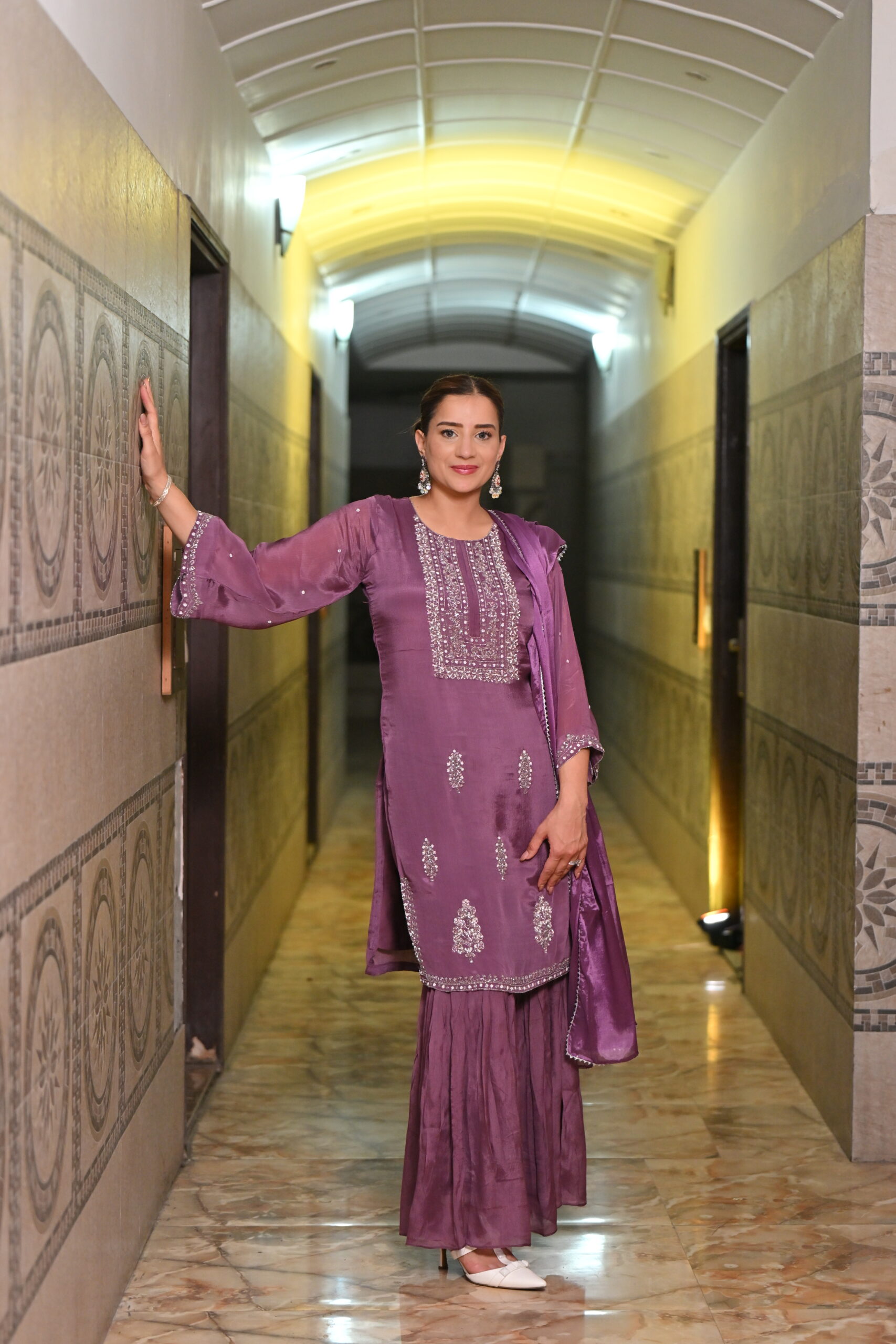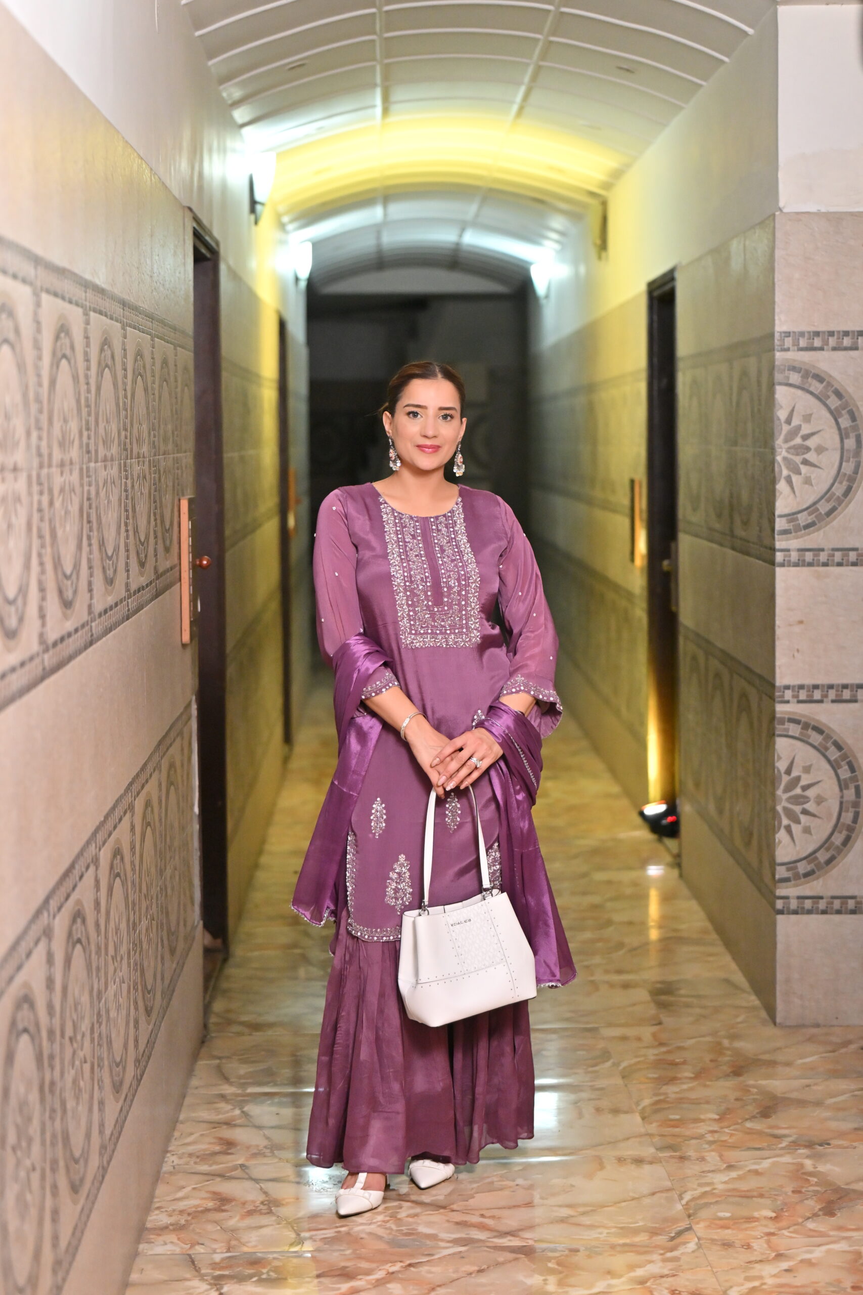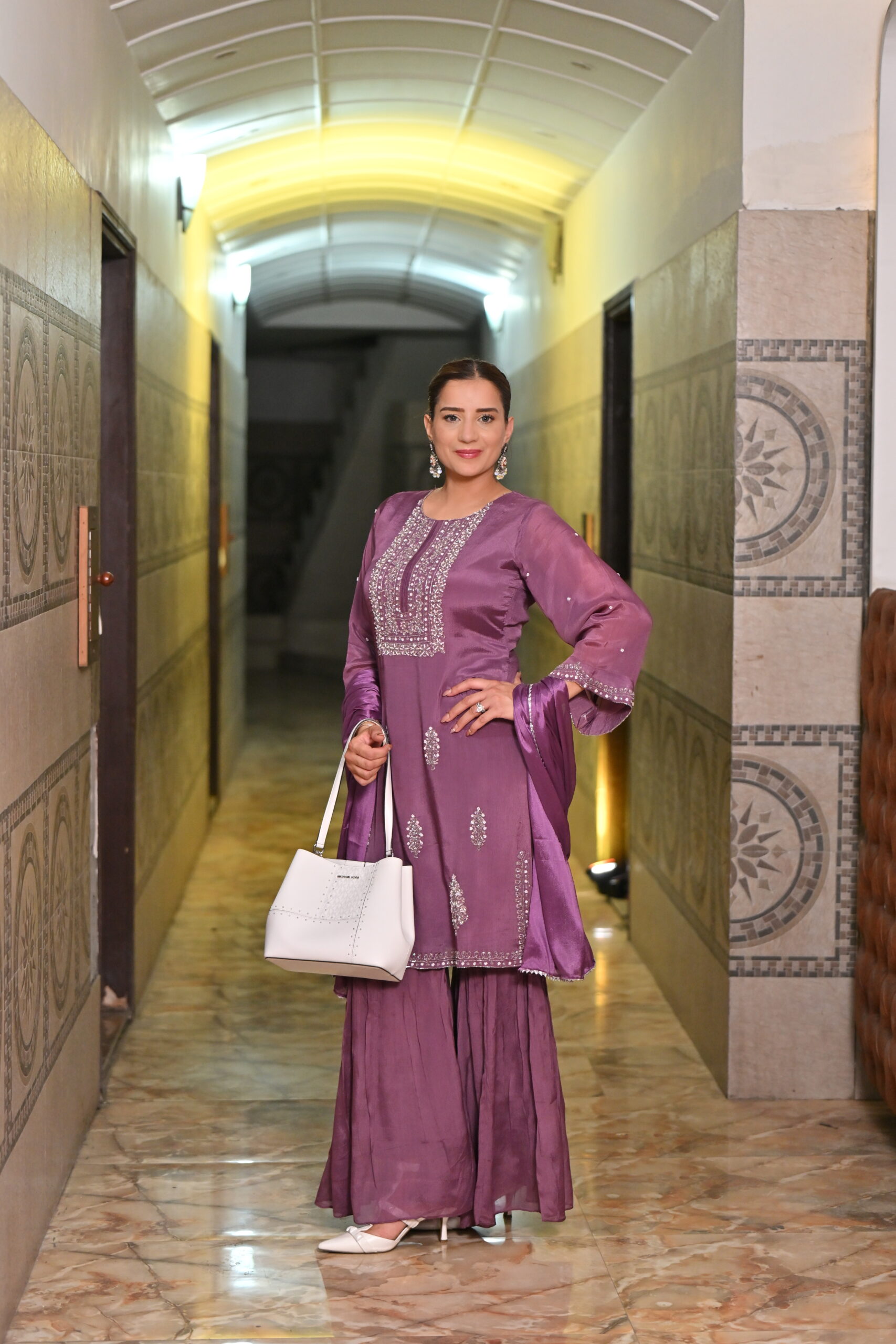 Elevate your festive and formal look with our Amethyst Grace Sharara Set. This stunning three-piece ensemble features a rich amethyst purple kurta adorned with intricate silver thread and sequin embroidery on the neckline and front. The flared sharara pants add a touch of regal elegance, while the matching dupatta with delicate borders completes the look. Crafted from a soft, flowy fabric, this set blends traditional charm with contemporary grace — perfect for weddings, celebrations, or evening gatherings.