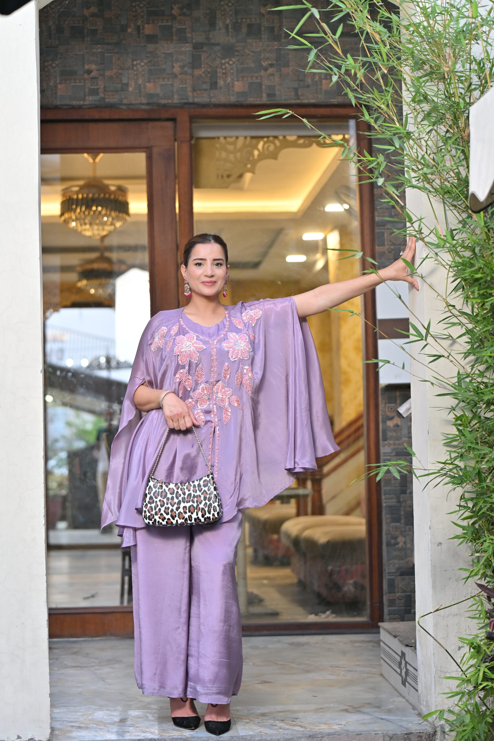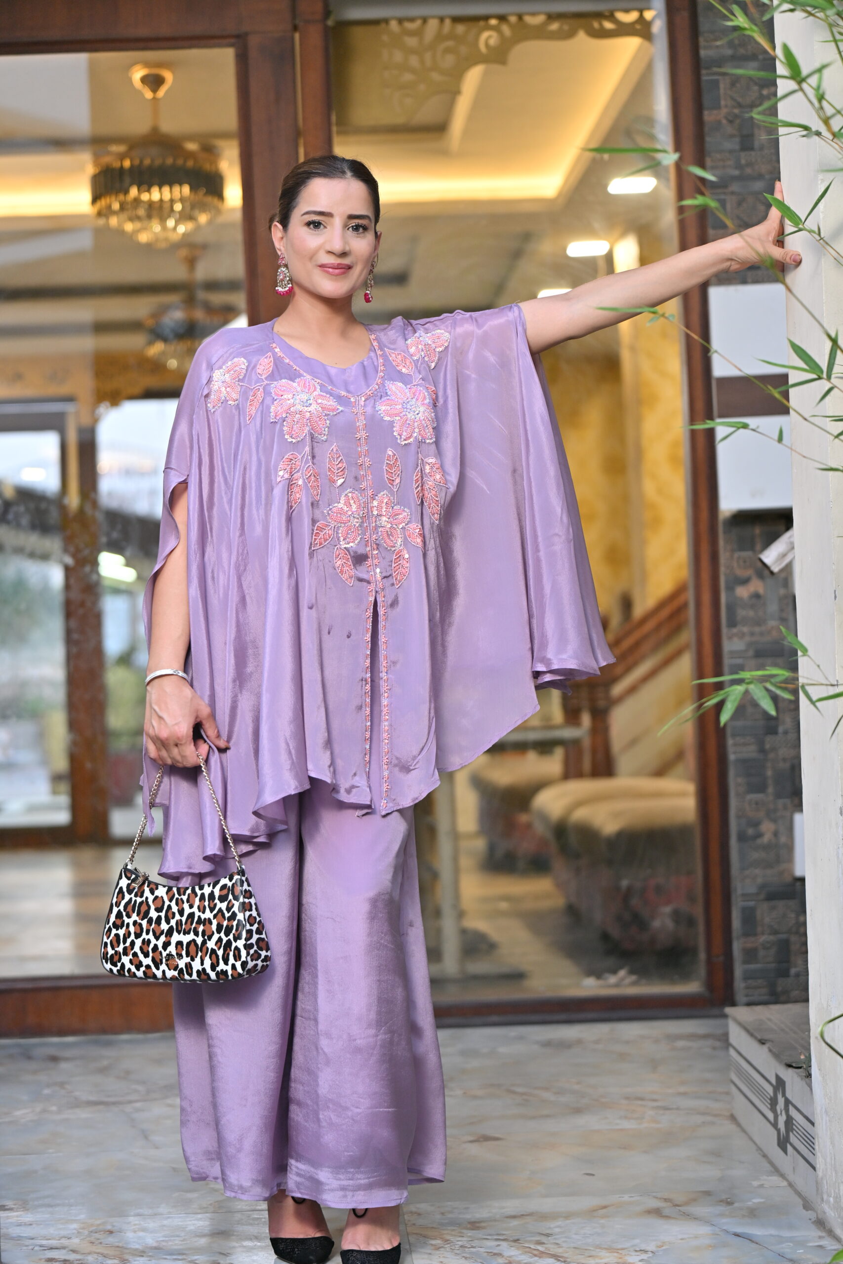Step into timeless elegance with our Lavender Bloom Cape Set, a luxurious three-piece ensemble perfect for festive occasions and evening gatherings. This outfit features a satin silk base in a soft lavender hue, creating a rich, flowing silhouette. The highlight of the set is the stunning cape-style top, beautifully adorned with intricate floral embroidery in pastel pink and silver threadwork. The cape drapes gracefully over the shoulders, giving a modern twist to traditional wear.