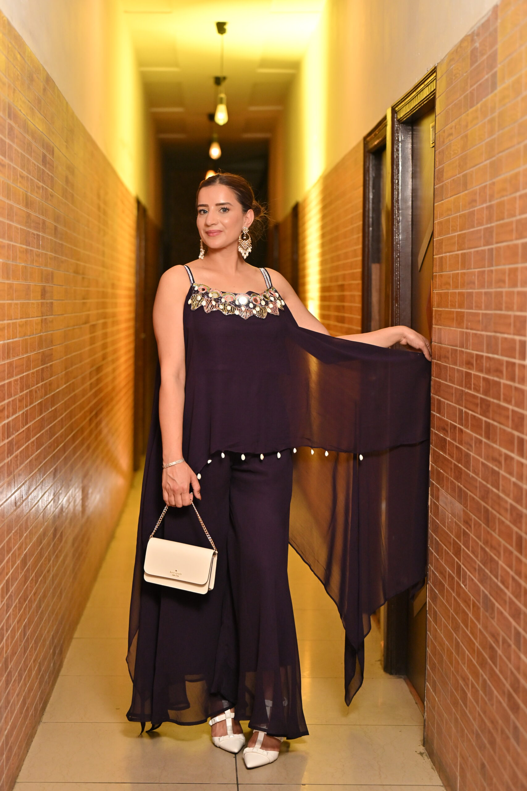 Turn heads with this stunning two piece co-ord set in a rich midnight purple hue. The ensemble features a flowy cape-style top with delicate mirror and bead embroidery along the neckline, adding a touch of glamour. The asymmetrical drape sleeves are adorned with tiny pearl drops for an ethereal finish. Paired with wide-leg sheer palazzo pants, this look offers elegance with comfort. Perfect for festive occasions, cocktail evenings, or wedding celebrations.Additional information